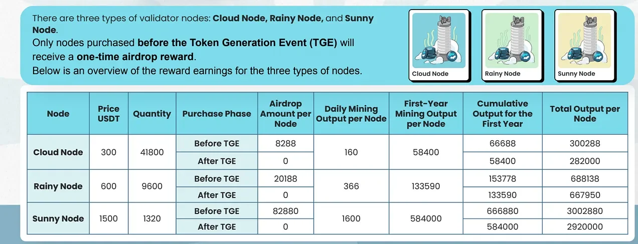 Summary: Three different nodes / validators are being offered. They start at $300 with the Cloud Node, then the $600 rainy node all the way to the $1500 Sunny Node. Truly pick your poison.